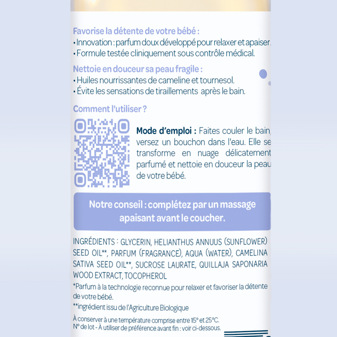 El baño relajante Biolane calma a tu bebé gracias a su fragancia suave, calmante y relajante. Limpia con suavidad su piel sensible.
