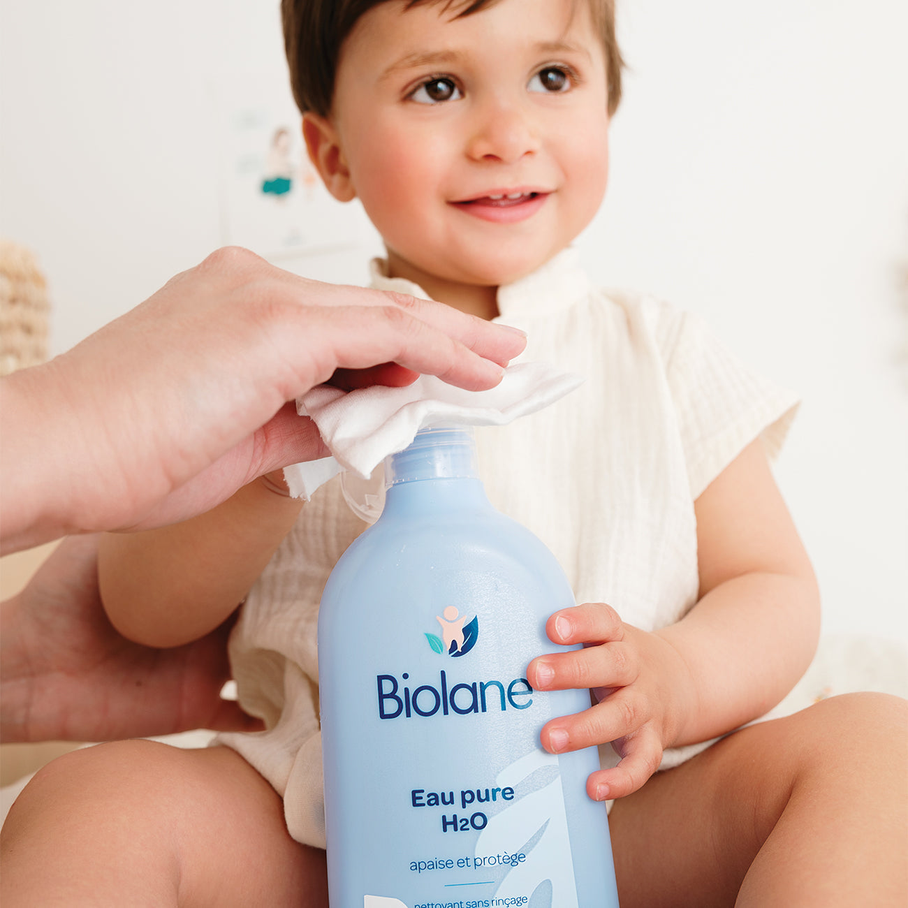 El agua pura H2O Biolane limpia perfectamente y con suavidad el rostro, el cuerpo y el culito de tu bebé, dejando la piel limpia y delicadamente perfumada.