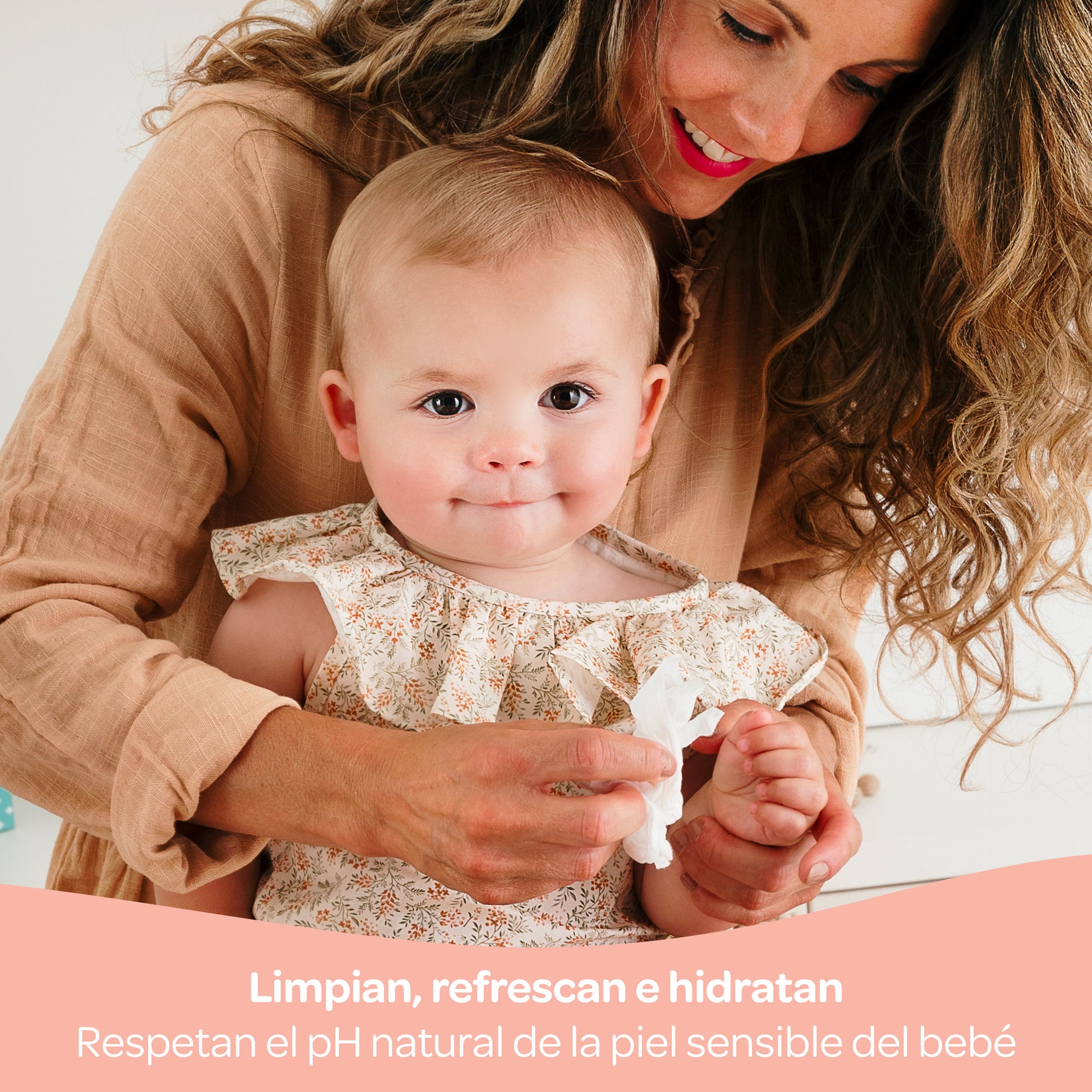 - Toallitas con un 97 % de ingredientes de origen natural, formuladas con PH fisiológico para preservar el equilibrio de la piel de tu bebé y proporcionarle una hidratación duradera.