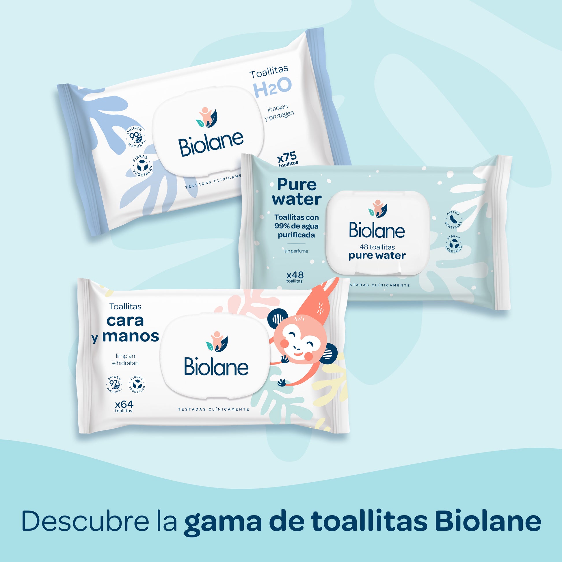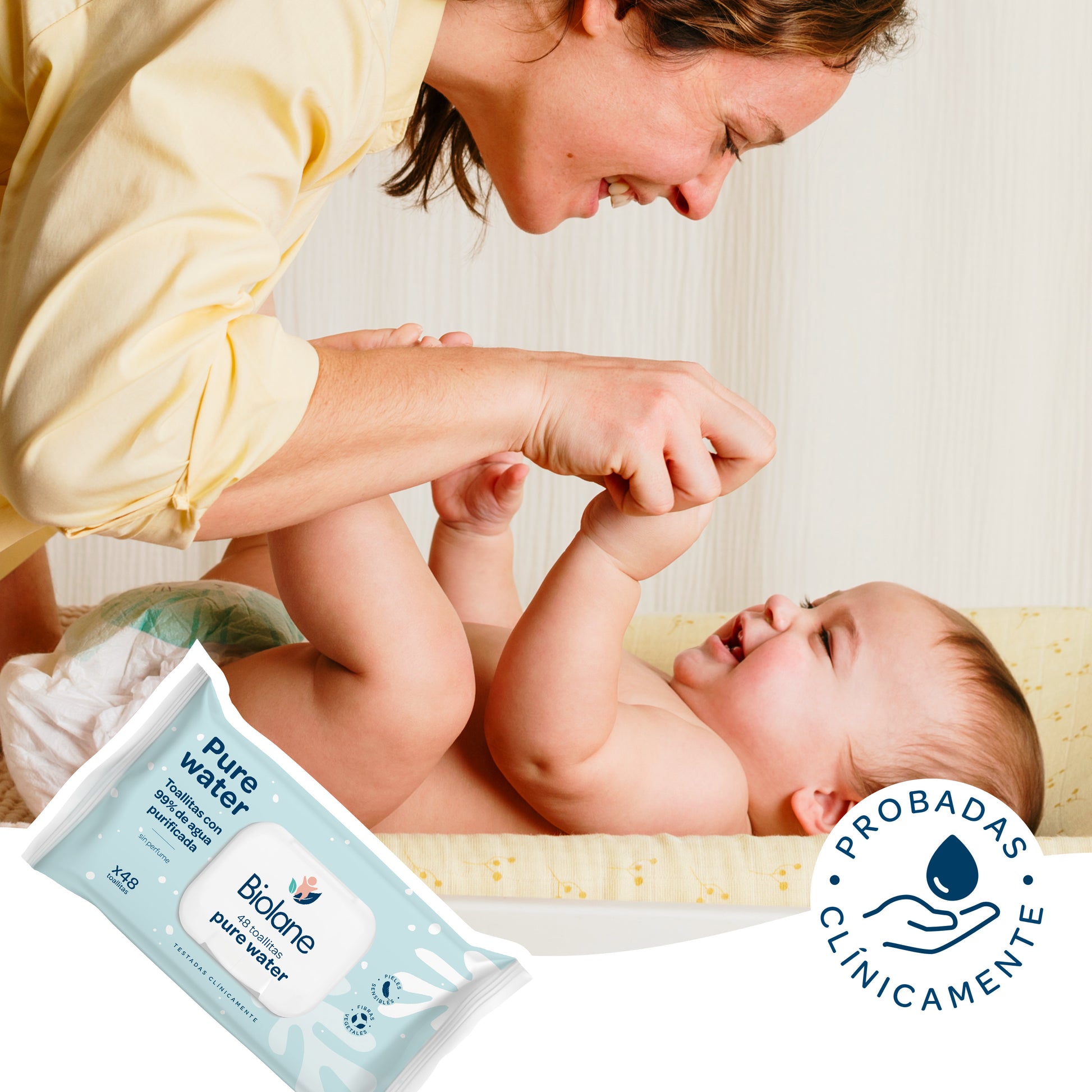Las toallitas Pure Water Biolane limpian suavemente el culito, el cuerpo y el rostro de tu bebé en un solo paso.